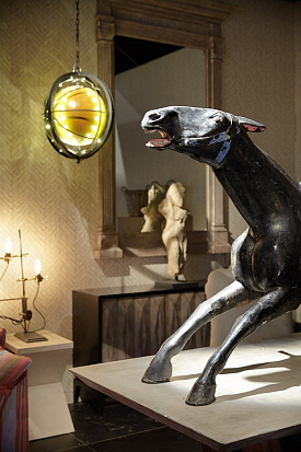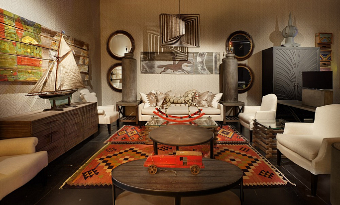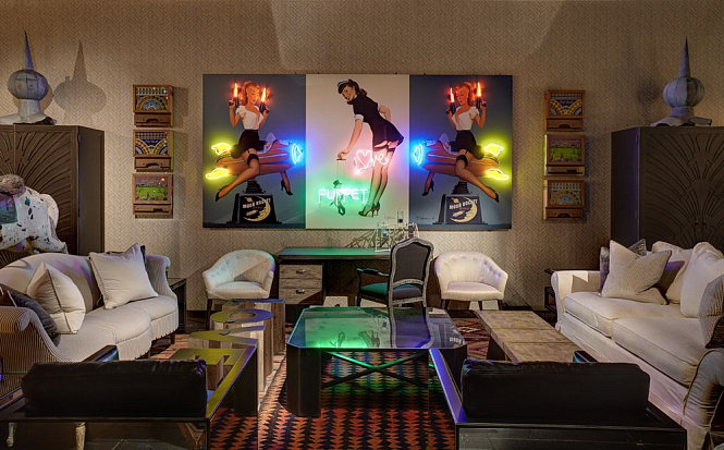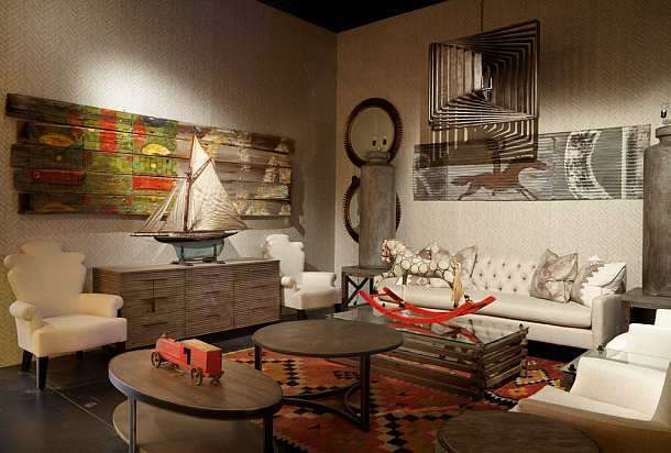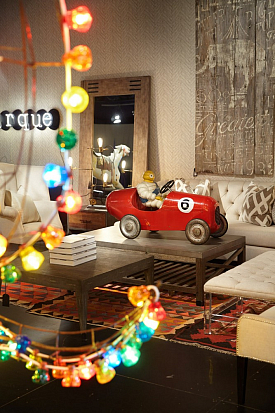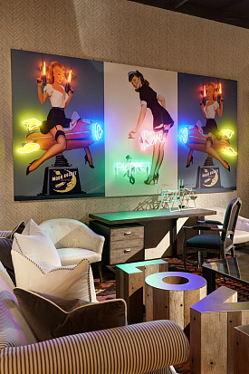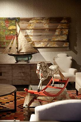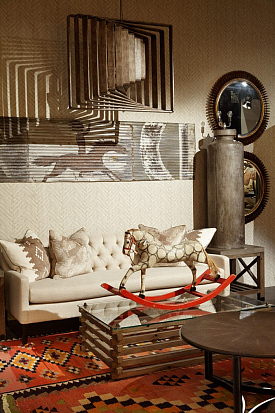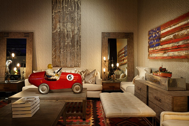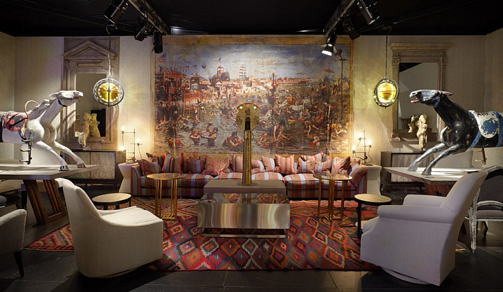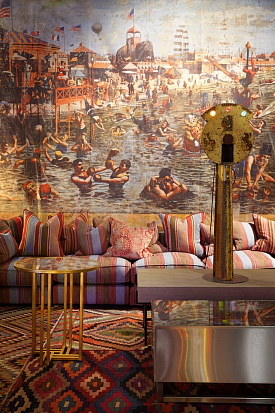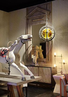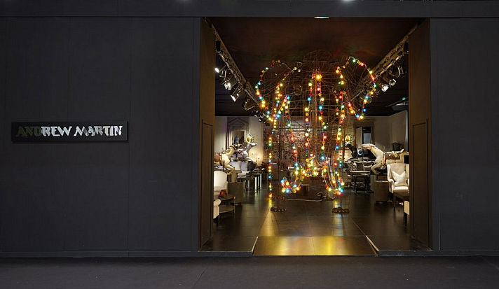 Мартин Уоллер, основатель культового британского бренда Andrew Martin, на парижской выставке, как всегда, привлек внимание посетителей своим оригинальным и ярким стендом. Каждый раз пространство, оформленное мебелью, светильниками и диковинным вещами скорее представляет собой художественную инсталляцию на заданную тему, нежели стенд с новинками бренда. В этом году Мартин пригласил своих поклонников в настоящий парк развлечений. Встречающий гостей огромный слон из разноцветных электрических лампочек, детали старинных каруселей, старые игрушечные машины и винтажные телескопы напомнили об открывшемся в начале прошлого века первом луна-парке на Кони-Айленде в Нью Йорке. Наслаждаясь сказочной экспозицией, посетители стенда Andrew Martin познакомились с новинками бренда, органично вписавшимися в фантастическую атмосферу парка аттракционов - новыми диванами и креслами в светлых обивках, выполненными в брутальной стилистике предметами из металла, бетона и состаренного дерева и экстравагантными футуристическими светильниками. Яркими штрихами стали любимые Мартином Уоллером винтажные постеры – гигантское полотно - панорама одного из первых луна-парков и плакаты игривых девушек в стиле пин-ап.