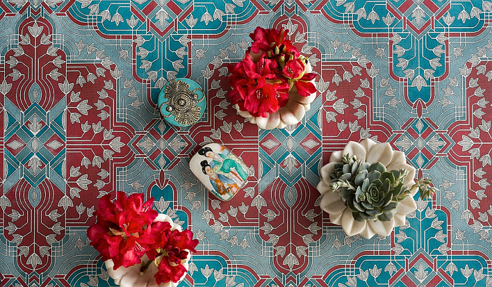 Новая интерьерная коллекция Кэтрин Мартин включает обивочные и портьерные ткани и виниловые обои. Винил в данном случае выбран дизайнером не случайно. С помощью этого материала удалось добиться рельефной фактуры покрытия, напоминающего марокканскую плитку или кожу ската. Ткани Majorelle — это характерные для марокканской культуры узоры на плотных, но мягких обивках, леопардовый рисунок на жаккарде с атласной основой, текстурированный бархат натуральных и активных цветов, включающий драматичный красный (реверанс в сторону знаменитой «Трилогии Красного Занавеса» База Лурмана — супруга Кэтрин Мартин). Дополняют коллекция фактурные обивки и легкие портьерные ткани нейтральных тонов.