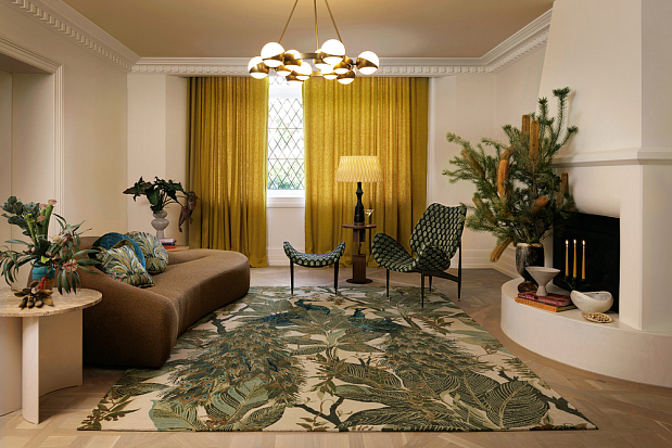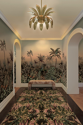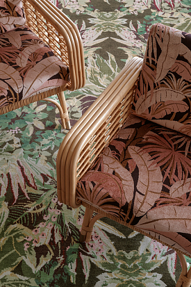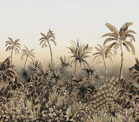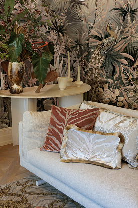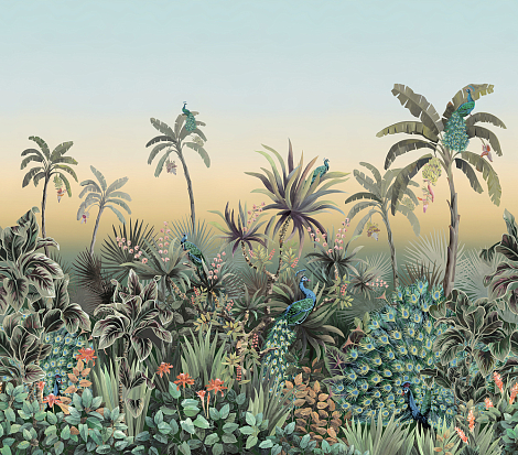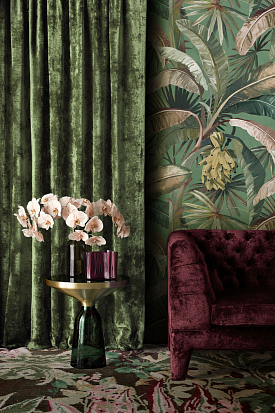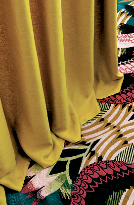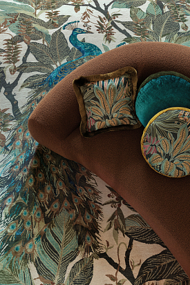 В роли грандиозного финального аккорда коллекции выступает живописный принт NIGHTBIRD SYMPHONY с изображением тропического сада с павлинами. NIGHTBIRD SYMPHONY выпускается в двух видах: напечатанным на широкой льняной ткани и на обоях с переливающейся поверхностью.
