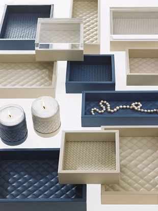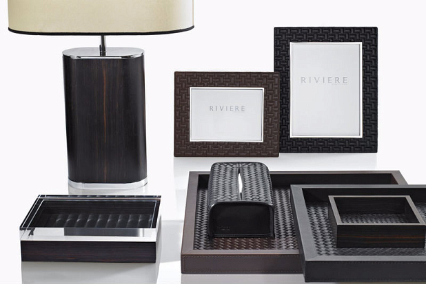 Все коллекции компании выполнены с большой любовью к красоте. Аксессуары Riviere создаются вручную из самых ценных материалов: роскошной кожи, рога, макасарского эбенового дерева в необычных сочетаниях с парусиной, бамбуком, хромом и акрилом. Одна из характерных стилевых особенностей Riviere –"шахматное" плетение тончайшей кожи, которое придает особое благородство и элегантность любым аксессуарам – от ваз до подсвечников.