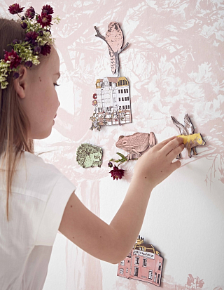 Для придания деткой комнате еще большей сказочности дизайнер придумала варианты обоев на магнитной основе с дополнительными сменными фигурками. С их помощью ребенок сможет разыгрывать различные сюжеты и самостоятельно менять обстановку в своей комнате.