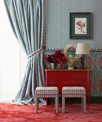 Новая интерьерная коллекция Кэтрин Мартин включает обивочные и портьерные ткани и виниловые обои. Винил в данном случае выбран дизайнером не случайно. С помощью этого материала удалось добиться рельефной фактуры покрытия, напоминающего марокканскую плитку или кожу ската. Ткани Majorelle — это характерные для марокканской культуры узоры на плотных, но мягких обивках, леопардовый рисунок на жаккарде с атласной основой, текстурированный бархат натуральных и активных цветов, включающий драматичный красный (реверанс в сторону знаменитой «Трилогии Красного Занавеса» База Лурмана — супруга Кэтрин Мартин). Дополняют коллекция фактурные обивки и легкие портьерные ткани нейтральных тонов.