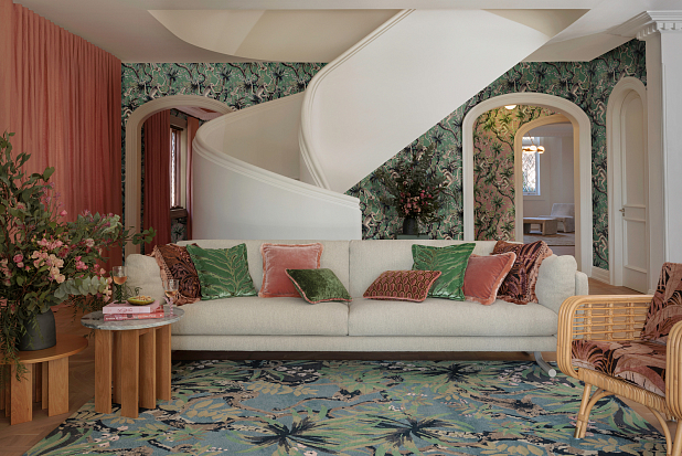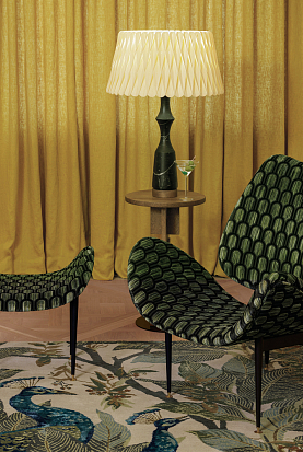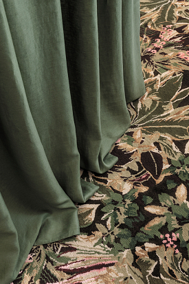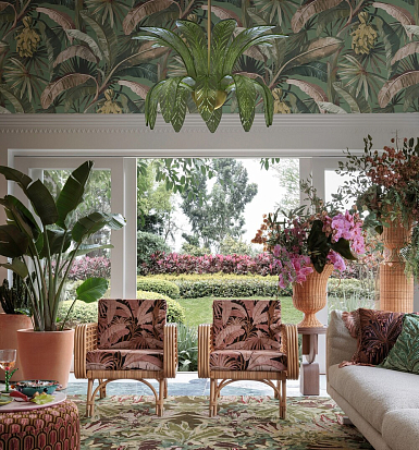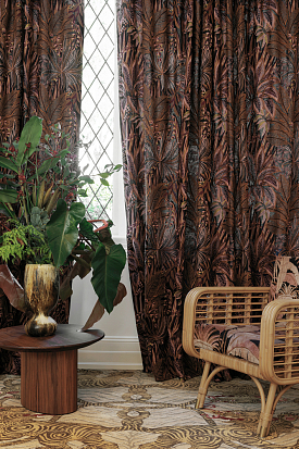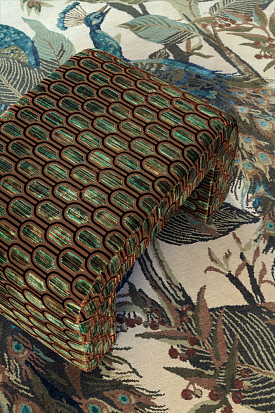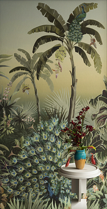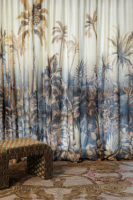 В роли грандиозного финального аккорда коллекции выступает живописный принт NIGHTBIRD SYMPHONY с изображением тропического сада с павлинами. NIGHTBIRD SYMPHONY выпускается в двух видах: напечатанным на широкой льняной ткани и на обоях с переливающейся поверхностью.