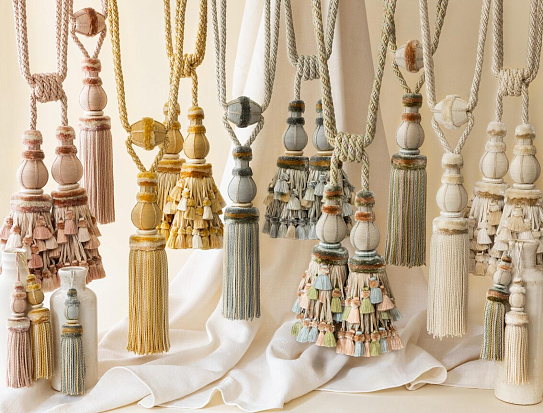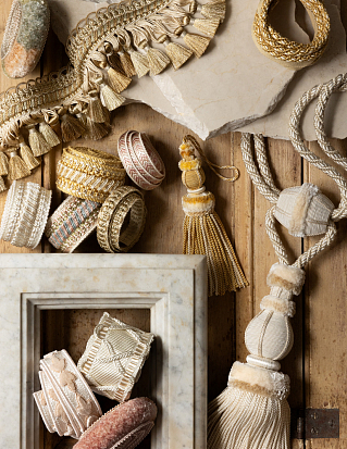 Новая коллекция Samuel & Sons Bagatelle выпущена в коллаборации с Тимоти Корриганом. Американский интерьерный дизайнер, признанный знаток исторической реставрации, Корриган создал коллекцию элегантных аксессуаров — позументов, бахромы, тесьмы, шнуров и кистей, вдохновляясь образцами французского неоклассицизма.