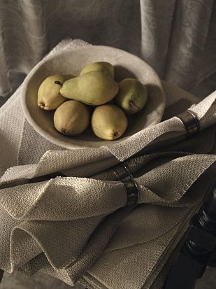 PORTRAIT — ткань с очень необычной структурой, идея которой была навеяна традиционной техникой плетения корзин. Она соткана в Италии из стопроцентной конопли. Её мягкая нейтральная палитра с деликатным включением цвета напоминает об акварельных портретах. Плотная, красиво драпирующаяся ткань Portrait подходит как для портьер, так и для обивки.