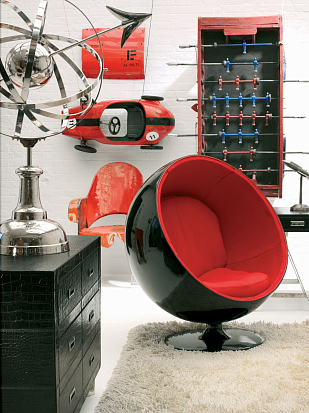 Этнические и современные предметы интерьера культовой английской марки Andrew Martin: шкуры, ковры, постеры, настольные лампы, мебель.